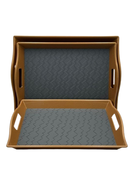 Premium Look: The trays feature a rich, metallic bronze or warm gold finish that provides a sophisticated and upscale appearance. Their curved, high edges and integrated side handles make for both safe carrying and stylish presentation.