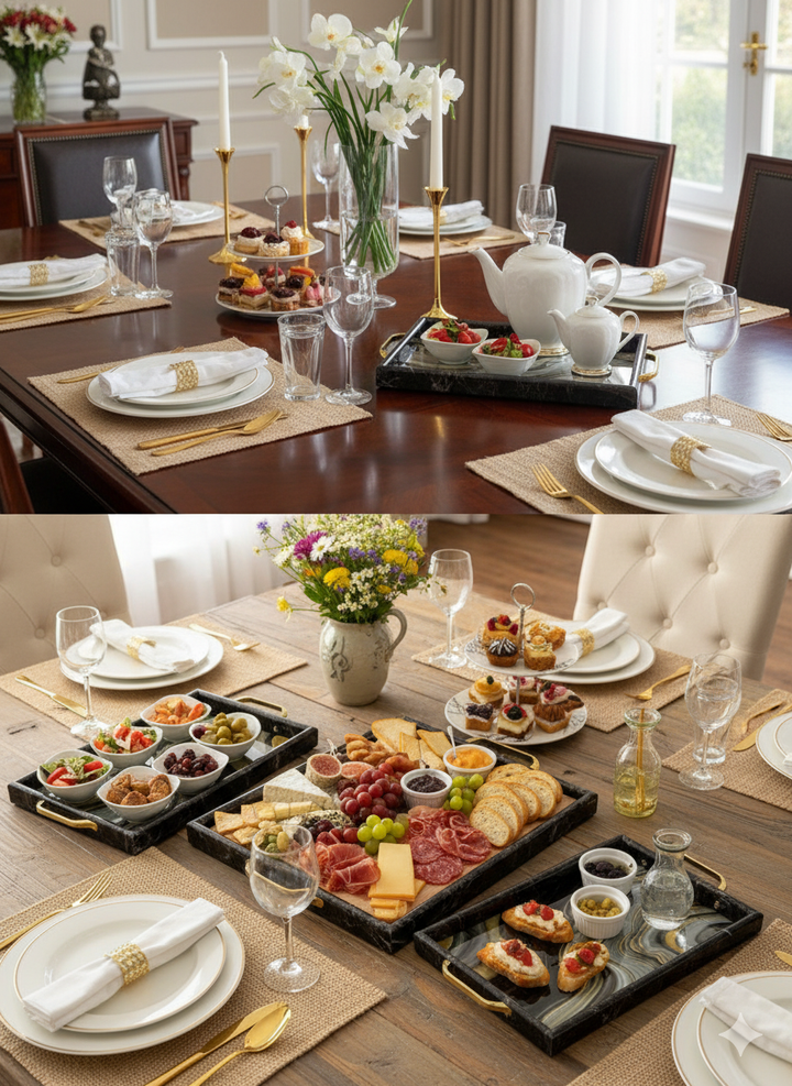 Accents: Each tray is finished with stylish, gold-toned metal handles, which provide both a convenient grip for serving and a beautiful decorative contrast to the dark surface.