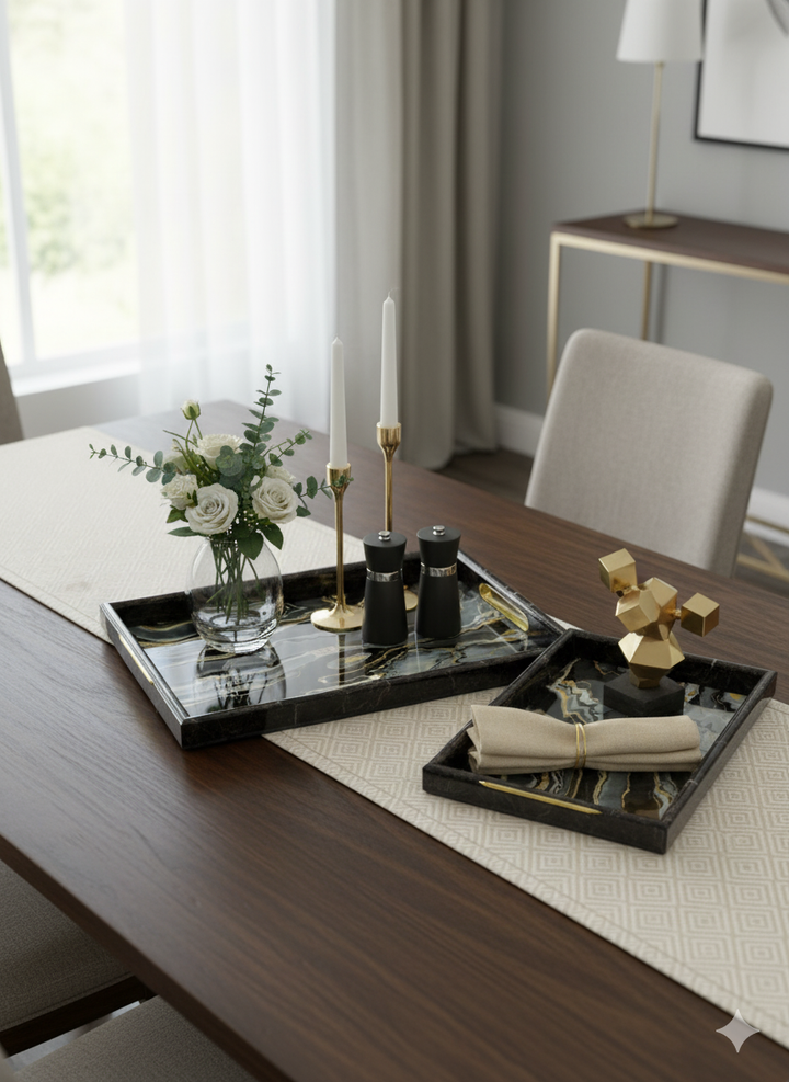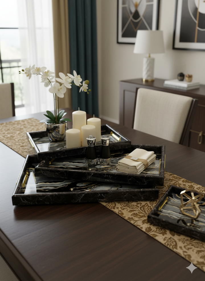 Material: The trays appear to be made from high-quality resin or engineered wood/MDF with a durable, scratch-resistant enamel or lacquer coating, giving them the luxurious visual texture of polished stone.