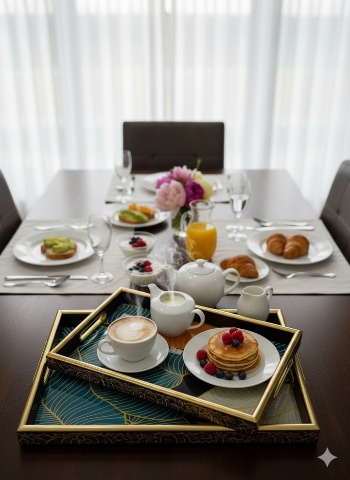 Accents: Each tray is finished with stylish, gold-toned metal handles, which provide both a convenient grip for serving and a beautiful decorative contrast to the dark surface.