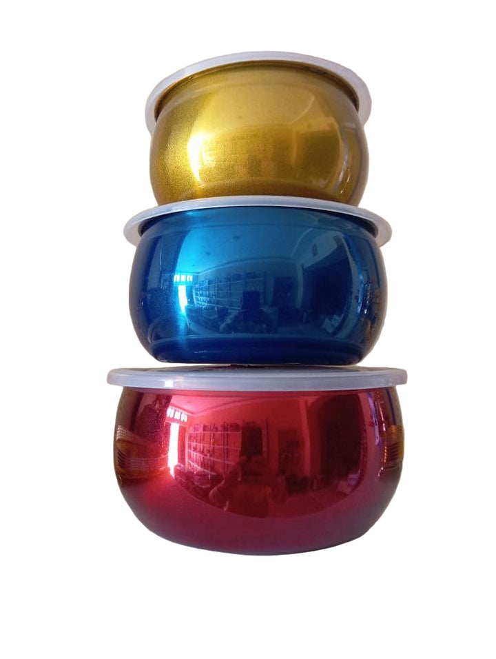 The containers feature a highly-polished, metallic finish in three distinct, vibrant colors: