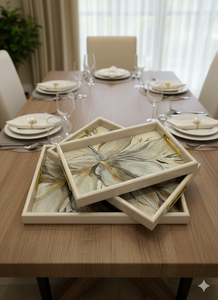 Material: The trays appear to be made from high-quality resin or engineered wood/MDF with a durable, scratch-resistant enamel or lacquer coating, giving them the luxurious visual texture of polished stone.