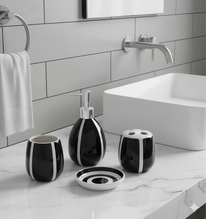 This is an elegant four-piece bathroom accessory set featuring a striking black and white design. The main pieces (soap dispenser, tumbler, and toothbrush holder) have an eye-catching ovoid/gourd shape with a glossy black finish accented by vertical, matte silver-white stripes. The accompanying soap dish complements the set with a contrasting circular striped pattern in black and white. The overall aesthetic is modern and bold, making it a sophisticated addition to any bathroom countertop.