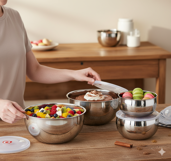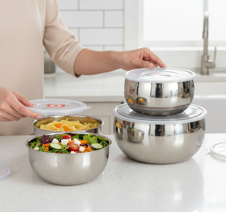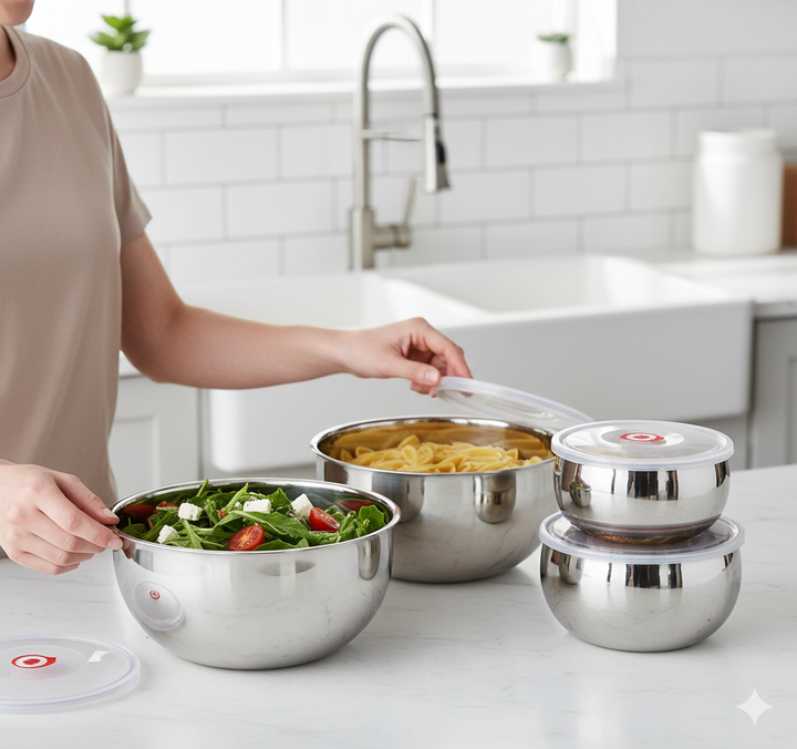 The bowls are designed to nest inside one another when empty (not shown fully but suggested by the graduated sizes), saving valuable cabinet space.