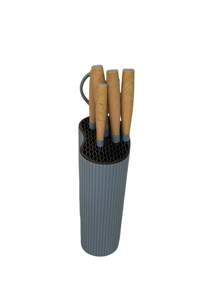 This stylish knife set combines modern design with practical functionality, making it a perfect addition to any kitchen. The set includes a variety of knives with wavy-patterned blades that are designed to prevent food from sticking