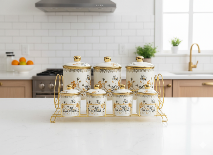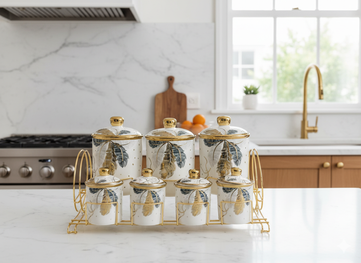 - Decorative Gold-Tone Rack: All seven canisters are elegantly displayed and organized on a sleek, polished gold-tone metal stand/rack. This rack not only ensures stability but also adds a stunning decorative element, featuring curved handles for easy transport.