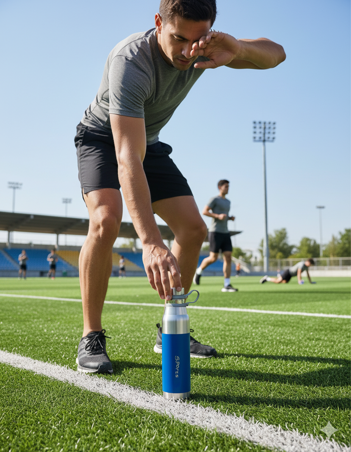 This product is a sleek, stainless steel sports water bottle designed for active use and maintaining drink temperature. The bottle features a modern, two-tone design with a metallic silver upper section and a vibrant blue lower section which has the word "Sports" printed vertically on it. It comes packaged in a simple, brown cardboard box that illustrates the bottle's key features.
