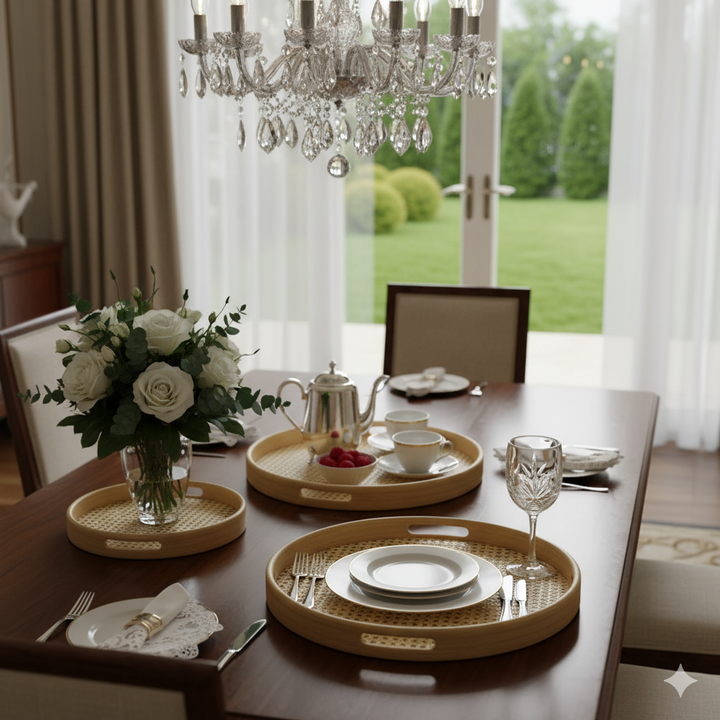 - Unique Rattan Detail: The distinctive rattan or cane pattern on the base of each tray adds a touch of rustic charm and visual interest.