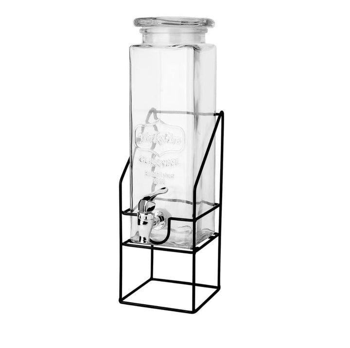 Stand: The dispenser sits securely within a black metal wire stand. This stand elevates the dispenser, which is crucial for placing a glass underneath the spigot. The stand itself has a geometric, modern-looking square base.