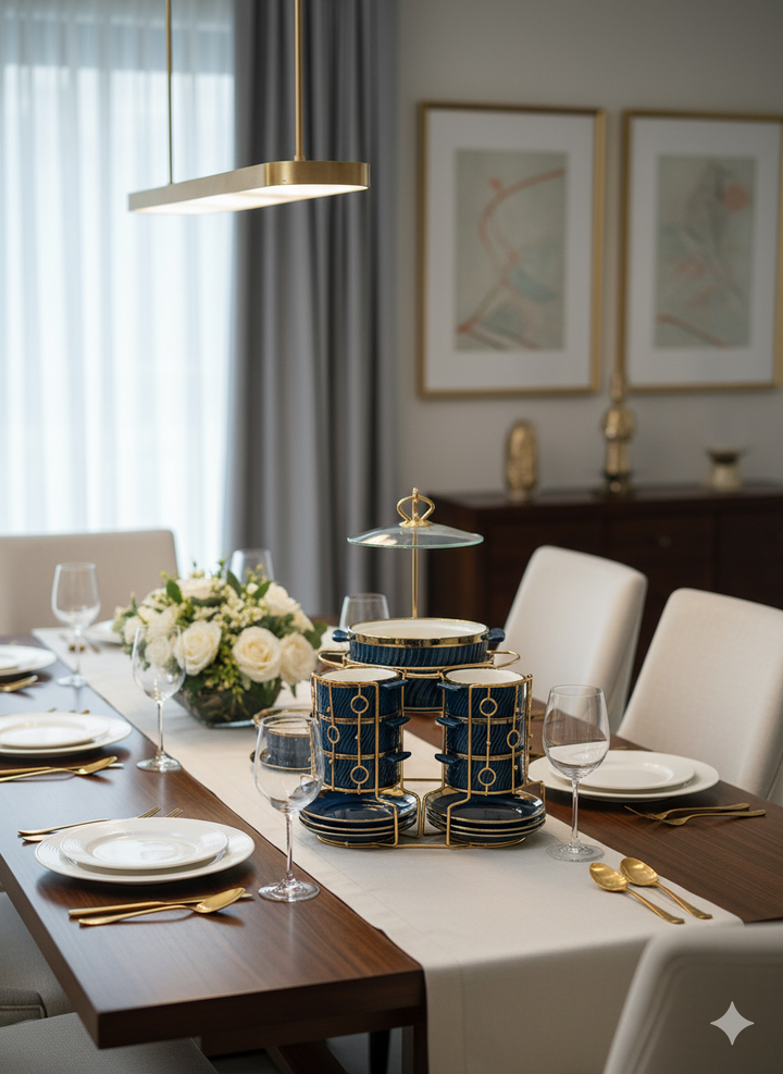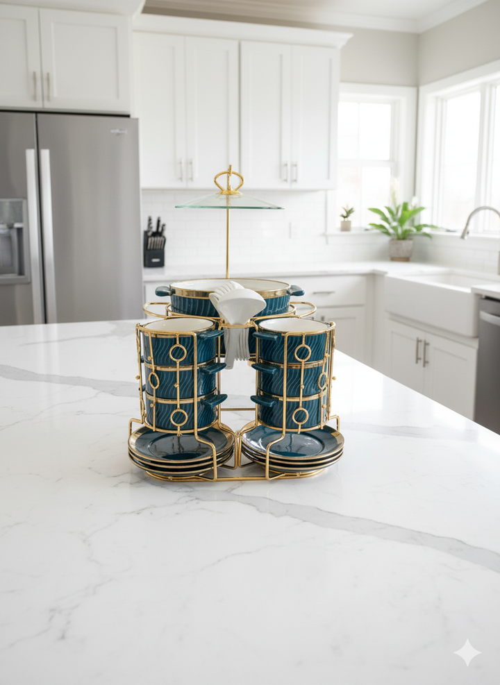 This elegant set includes 6 blue ceramic cups, 6 matching saucers, and 6 white ceramic spoons, all arranged neatly in a beautifully crafted gold metal stand. The sleek, ribbed blue design with a glossy finish is paired perfectly with gold accents, giving a premium look. A tempered glass top shelf adds extra charm and functionality – perfect for small treats or display.