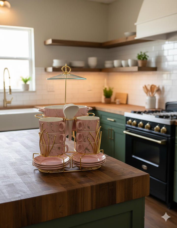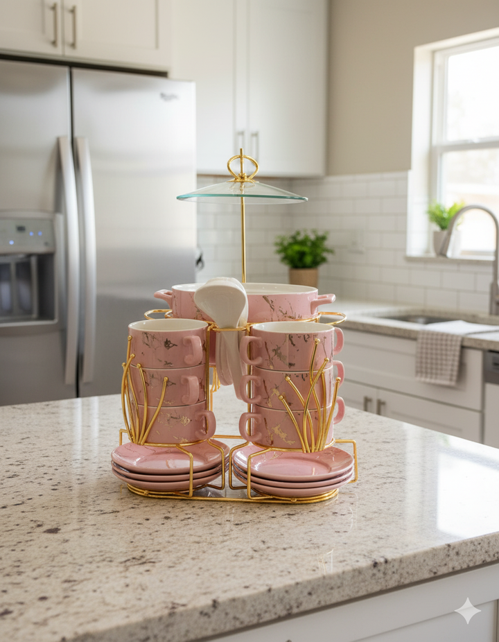 This elegant set includes 6 pink ceramic cups, 6 matching saucers, and 6 pink ceramic spoons, all arranged neatly in a beautifully crafted gold metal stand. The sleek, ribbed pink design with a glossy finish is paired perfectly with gold accents, giving a premium look. A tempered glass top shelf adds extra charm and functionality – perfect for small treats or display.