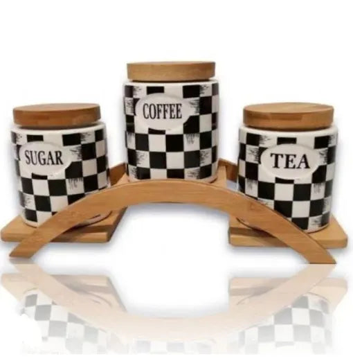 Add charm and functionality to your countertop with this 3-piece ceramic storage jar set for sugar, coffee, and tea. Featuring a bold black-and-white checkered pattern with a distressed look, each jar is labeled for easy identification and comes with a secure wooden lid to keep contents fresh. The jars sit neatly on a stylish arched wooden rack, blending modern farmhouse aesthetics with everyday practicality.