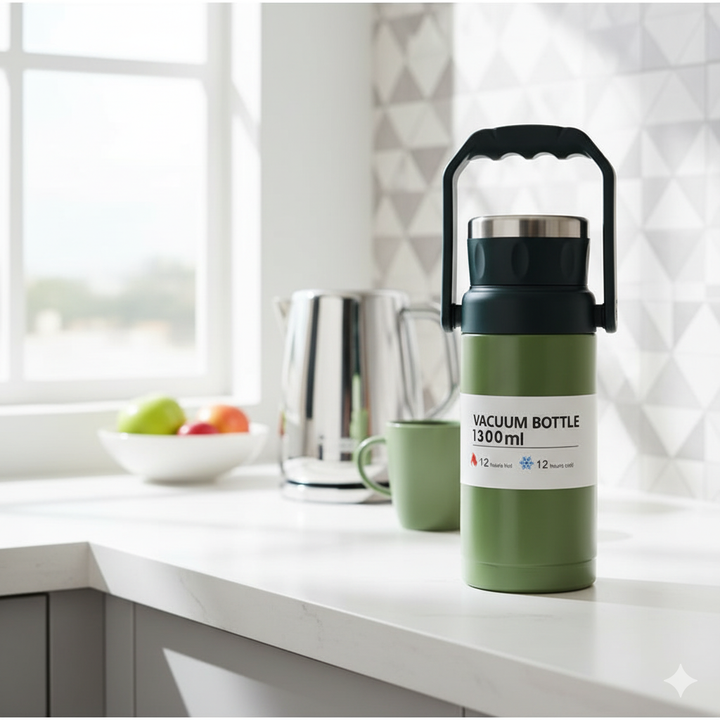 This is a sturdy, cylindrical vacuum bottle with a practical, sporty look. It features a main body in a matte olive green color and a contrasting dark green/black plastic top section. The bottle has a robust, wide carrying handle attached to the neck, making it easy to transport even when full. A silver-colored stainless steel cap is visible at the very top. A label indicates its capacity is 1300 ml and highlights its insulation capabilities.