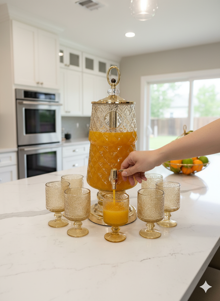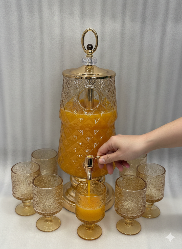 Material:The main body of the dispenser is made from thick, textured glass with a gorgeous amber or light gold hue. The stand, lid, tap, and handle are all metal with a polished gold finish. The accompanying small glass also matches the textured, ornate style and golden tone of the dispenser