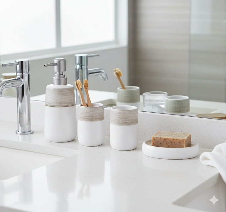 The set features a modern, minimalist design with a two-tone aesthetic. The pieces are primarily white on the bottom half, with the top half having a light, textured, wood-grain or stone-like finish in a muted beige or taupe color. This design is versatile and would complement various bathroom decor styles, from rustic to contemporary.