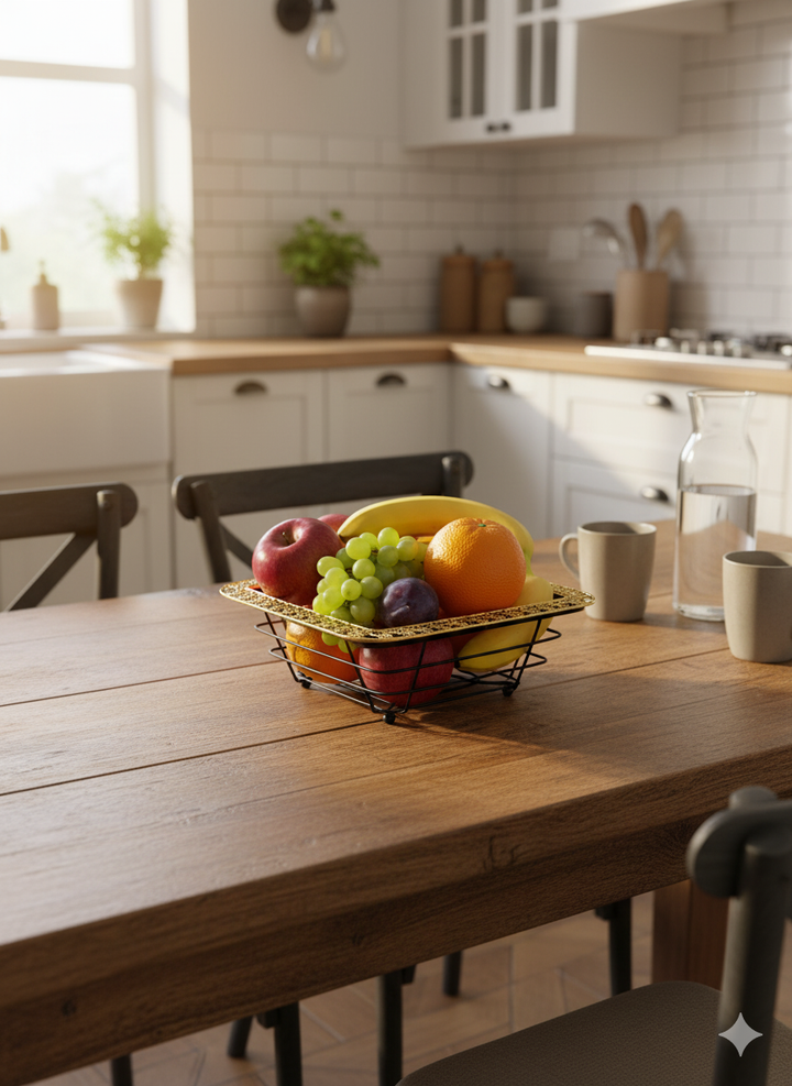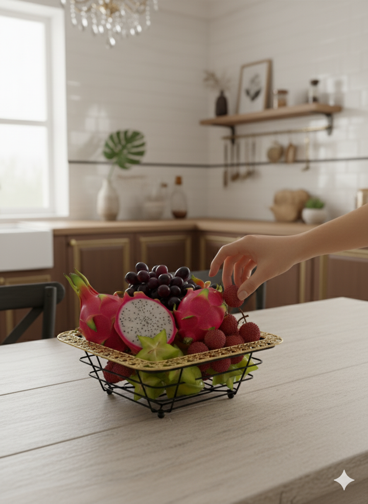 Aesthetics: The piece embodies a minimalist, geometric style often associated with contemporary and mid-century modern décor. The open design promotes air circulation, which is ideal for keeping fruit fresh.