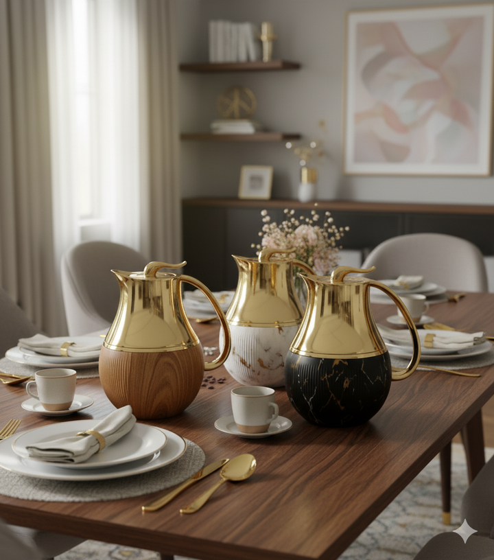 This is a stylish thermal carafe (or Dallah, depending on its intended use) featuring a luxurious, modern design.