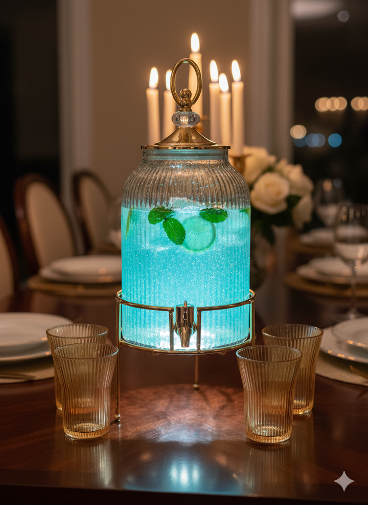 Lid: While the lid is not fully visible, these types of dispensers typically come with a lid (often glass, metal, or wood) to keep beverages fresh and protect them from dust or insects, making it suitable for both indoor and outdoor use.