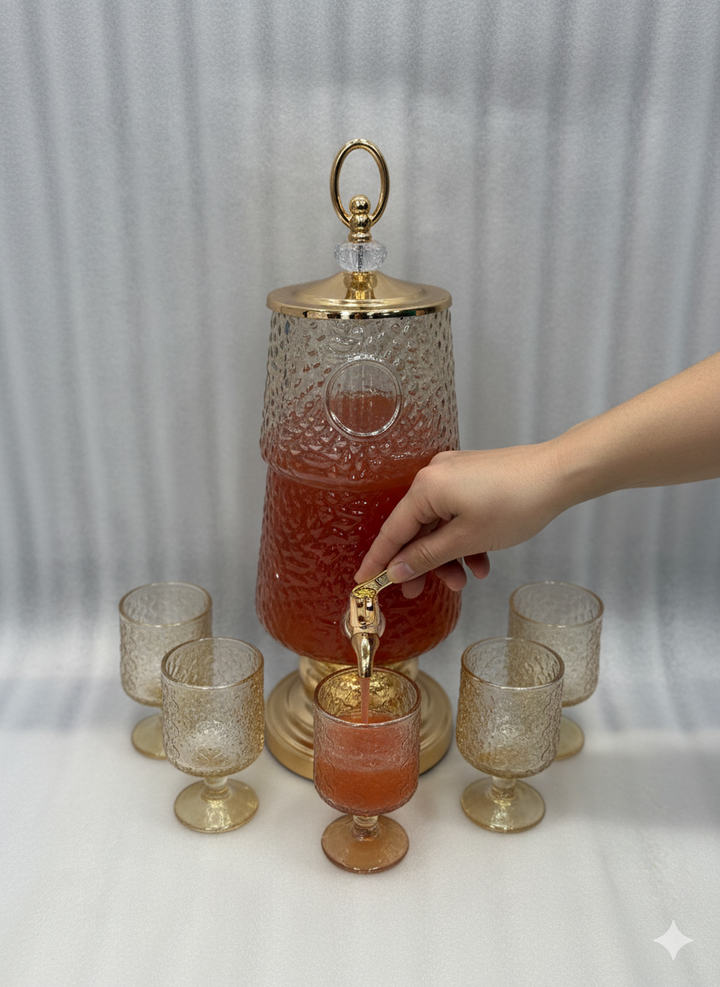 Gatsby Gold Toned Glass Beverage Dispenser 1Pc Dispenser 6Pc Glass