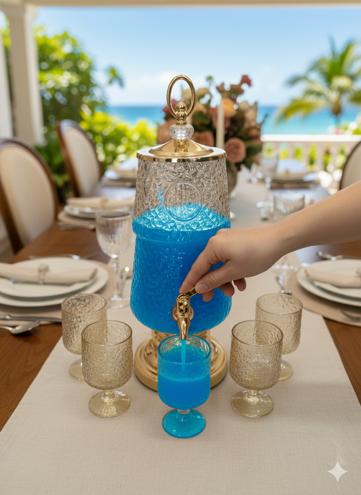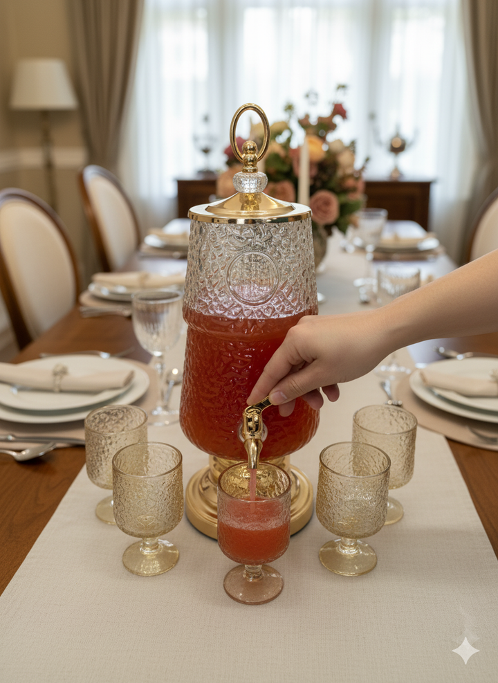A notable feature is its tiered, textured glass body, which is not only aesthetically pleasing but also serves a functional purpose. The intricate, patterned texture helps to disguise condensation and minor water spots that often accumulate on smooth glass dispensers, keeping the presentation looking pristine even during long events. This detailed design elevates a simple serving container into a striking decorative centerpiece.
