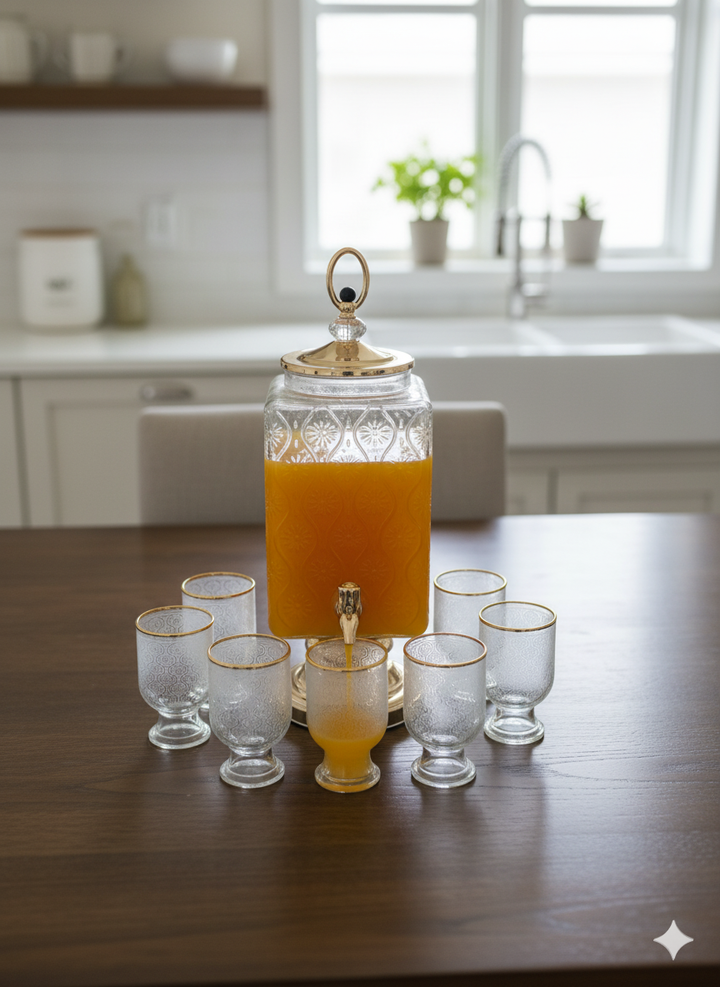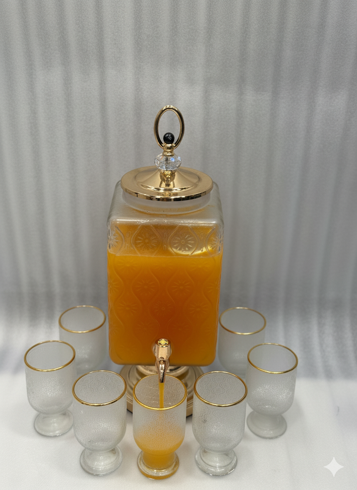 Golden Trim Drink Dispenser Set 1Pc Dispenser 6Pc Glass