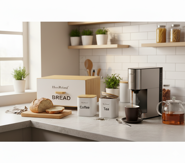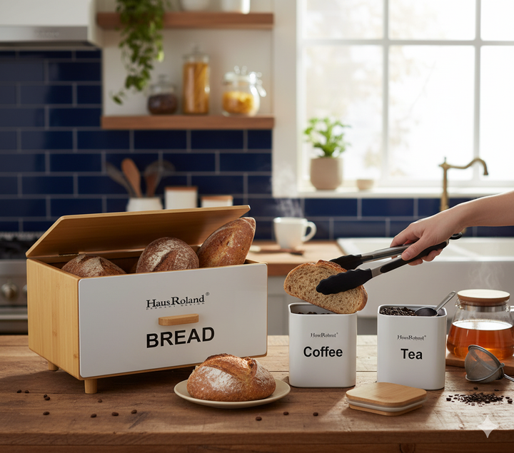 - The set includes a stylish bread box with a bamboo lid and a matching design, labeled "BREAD."