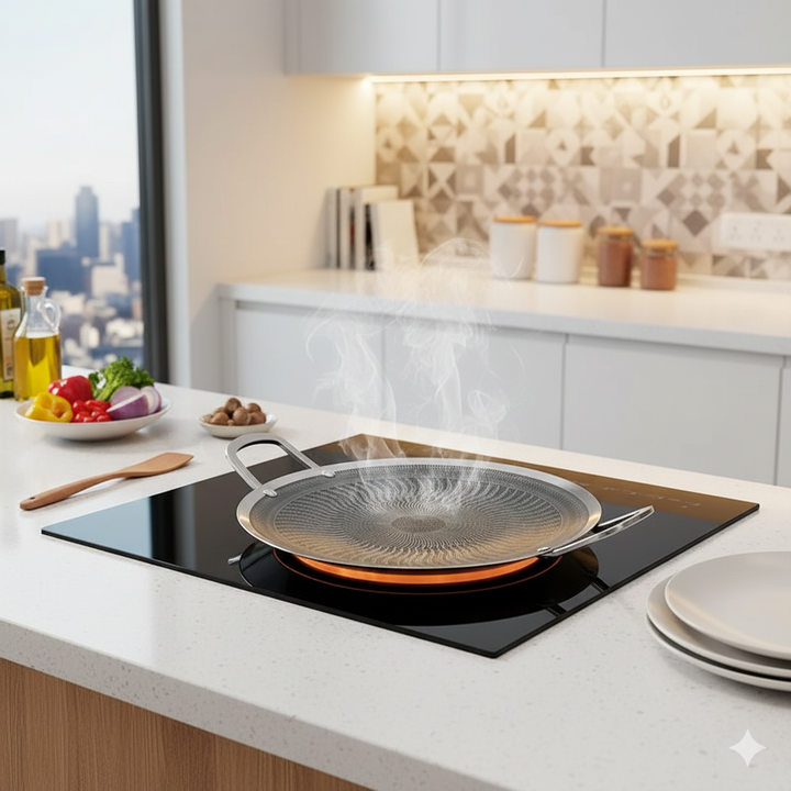 Non-Stick or Low-Stick Property: This texture is likely a honeycomb, wave, or laser-etched non-stick coating (often involving PFOA-free materials like PTFE or a ceramic base). The pattern creates microscopic air pockets and raised ridges, which reduces the surface area where food can stick. This design is sometimes marketed as "bionic," "laser-etched," or "engraved" non-stick.