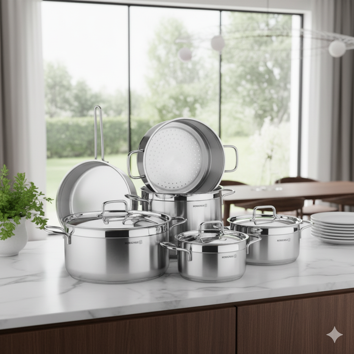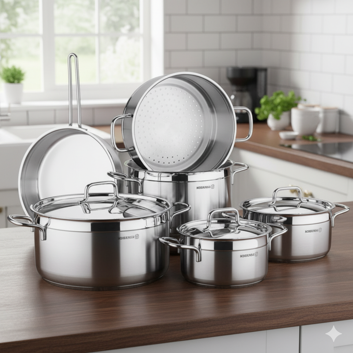 This appears to be a multi-piece cookware set, likely made of high-quality stainless steel, judging by the shiny, reflective finish. Stainless steel is a popular choice for cookware because it's durable, non-reactive, and relatively easy to clean.