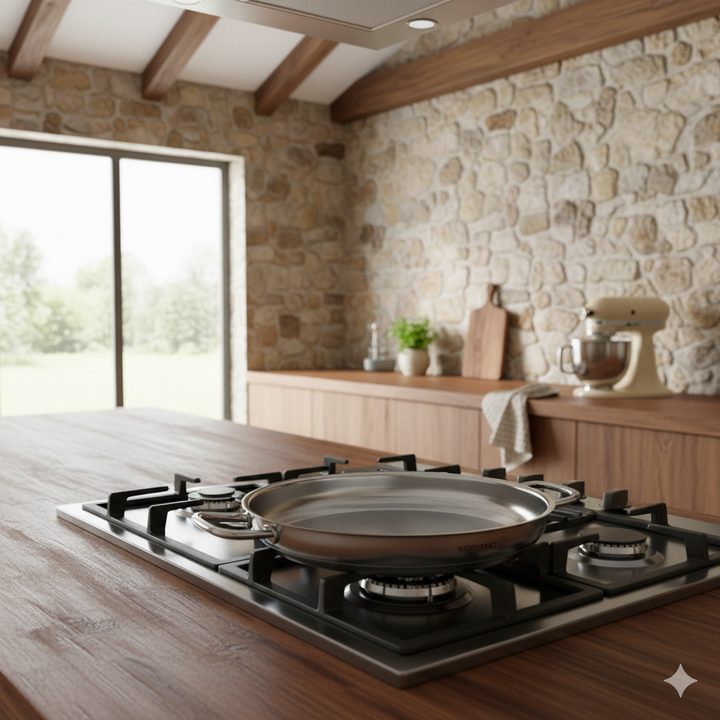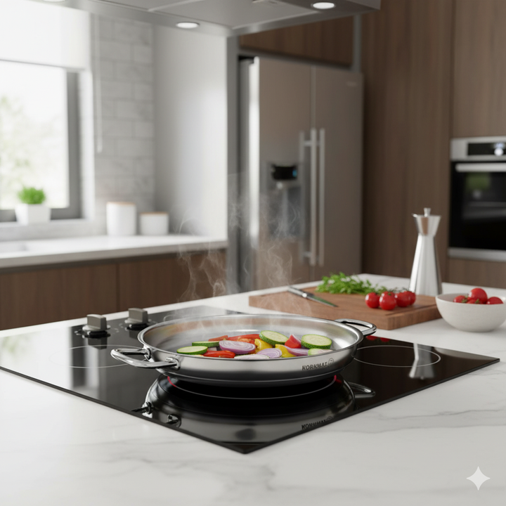 Properties: Stainless steel is highly durable, non-reactive (meaning it won't leach flavors or chemicals into food), rust-resistant, and typically provides good heat distribution, especially when it features a layered or encapsulated base. It is also easy to clean and maintain.