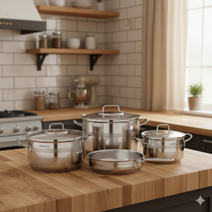Benefit: Stainless steel is highly valued in cookware for its durability, resistance to rust and corrosion, and its non-reactive nature, meaning it won't impart flavors or leach chemicals into food, even when cooking acidic ingredients.