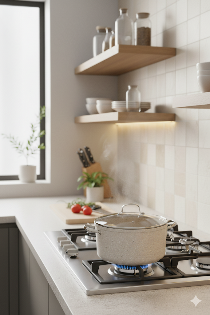 Granite coat non stick series with beautiful sleek stainless steel handles and heavy guage induction bottom.
