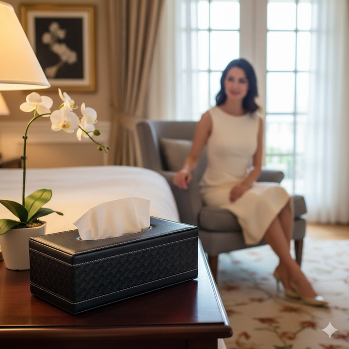 PU leather tissue box cover with a magnetic bottom, designed to hold standard tissue boxes. It is durable, easy to clean, and suitable for various settings such as home, office, and car. It is also designed to be a stylish addition to decor and a great gift for housewarming.