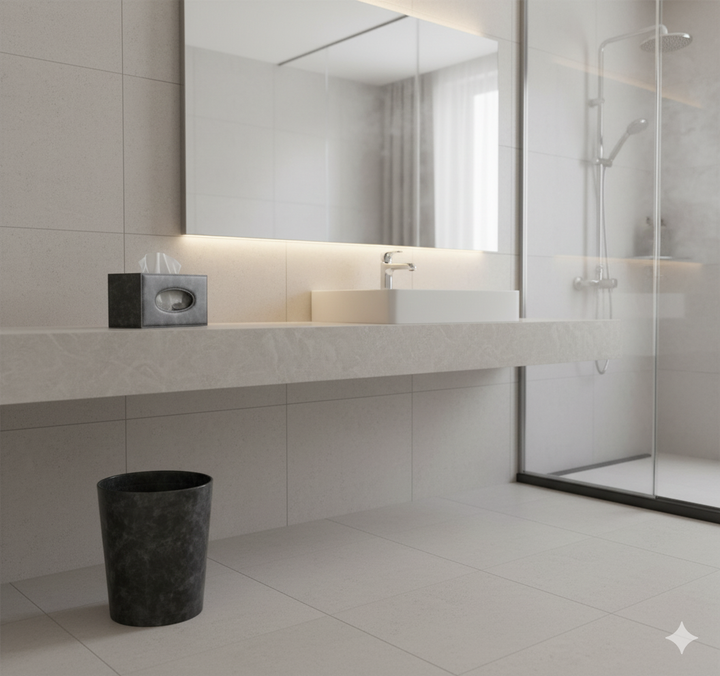 This is a matching two-piece set for common household or office use, featuring a waste bin and a rectangular tissue box holder. Both items share a distinctive, dark, textured finish.