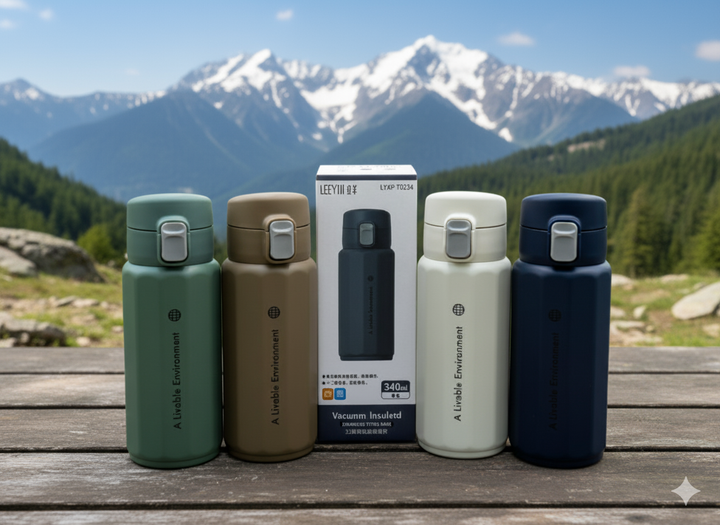 The central retail box indicates the brand name is LEEYII (or similar) and specifies the product as a "Vacuum Insulated Stainless Steel Mug" with a capacity of 340ml.