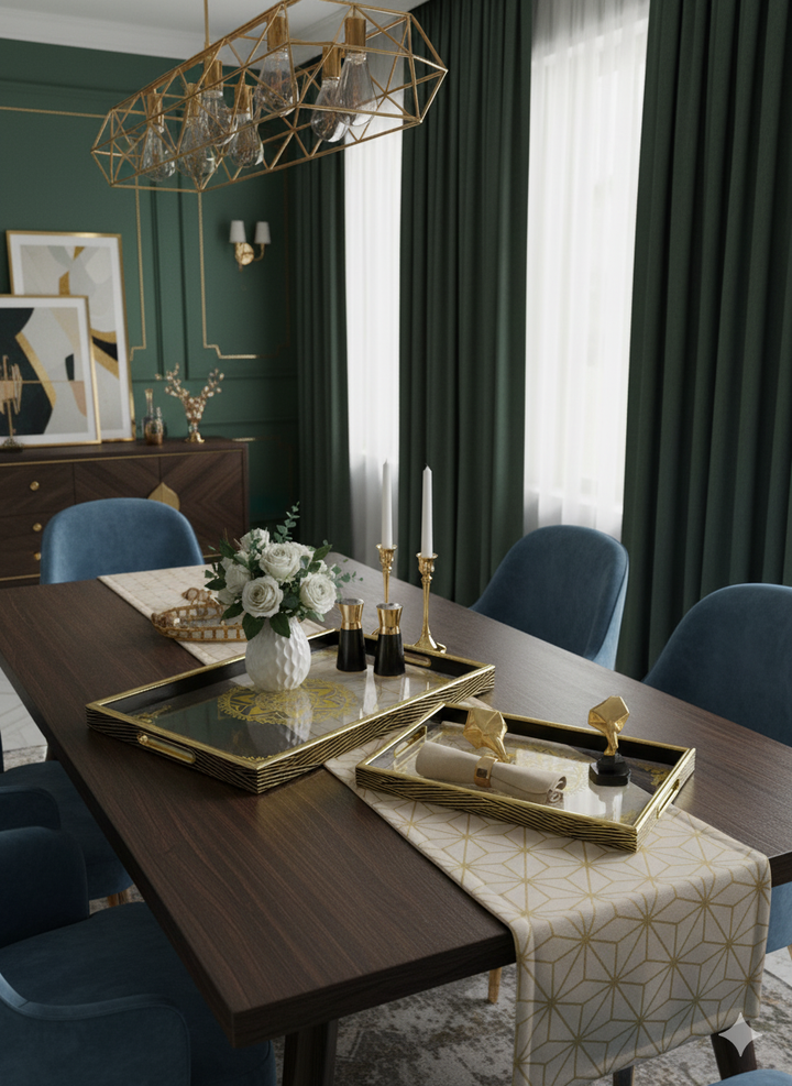 This is an elegant and versatile set of three rectangular trays featuring a stunning Glass Gold Designing Crafted to serve both functional and decorative purposes, this set adds a touch of high-end luxury to any space.