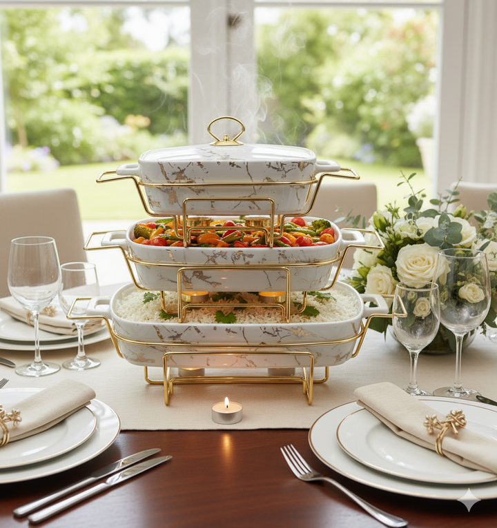 Buffet Service: It's ideal for a buffet-style dinner, brunch, or high tea, where the tiered design draws the eye and the warming feature keeps items at an enjoyable temperature.
