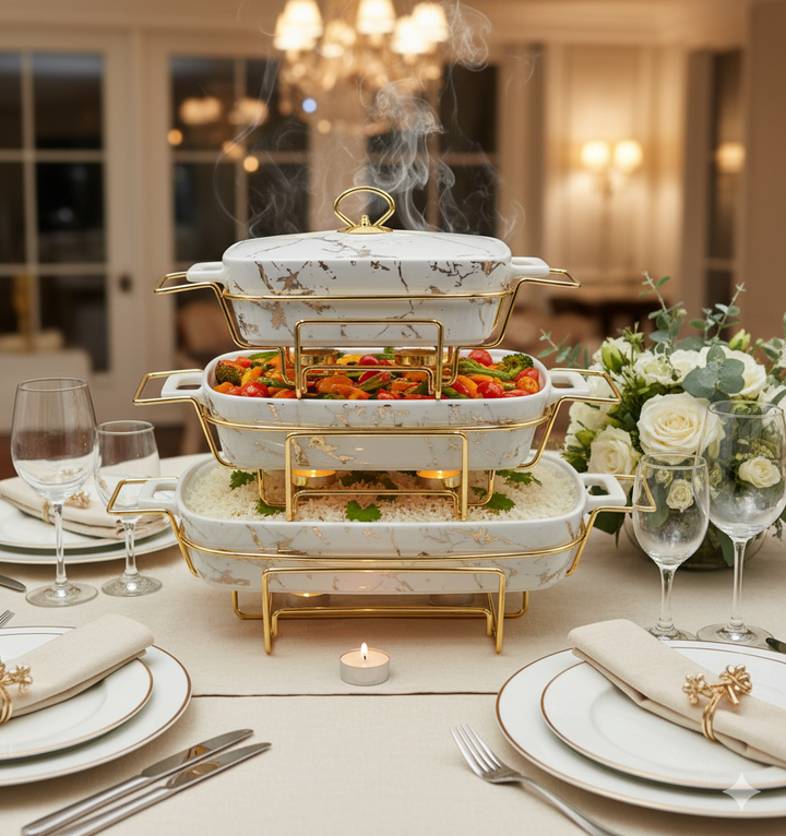 Luxury 3-Tier Ceramic Chafing Dish Buffet Server Set (RECT WHITE)
