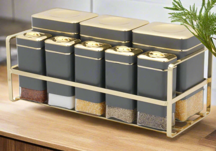 This is an elegant and modern eight-piece spice storage set housed in a matching gold-toned metal rack. The design features a striking black and gold color scheme, making it a decorative piece for any kitchen countertop or pantry. The set consists of eight individual, rectangular spice containers arranged in two tiers of four within the holding rack.