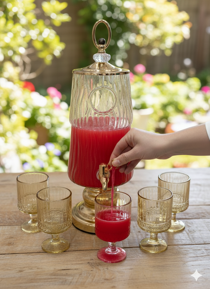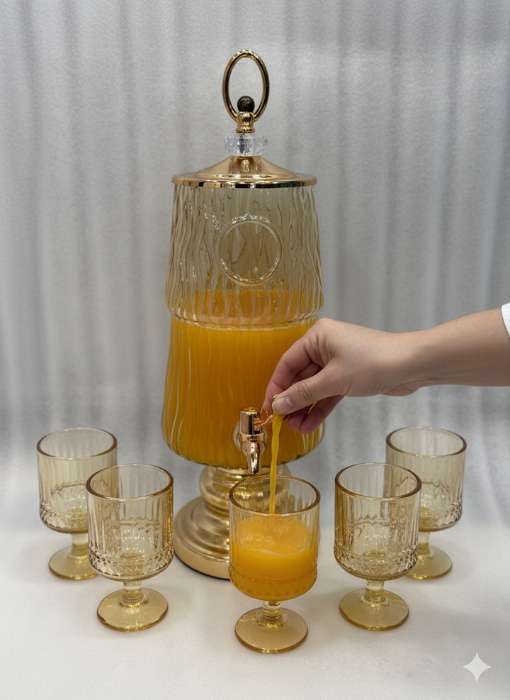 Aesthetic Appeal: The gold-tone accents on the base, lid, and spigot, combined with the textured glass, create a high-end, vintage, or royal aesthetic.