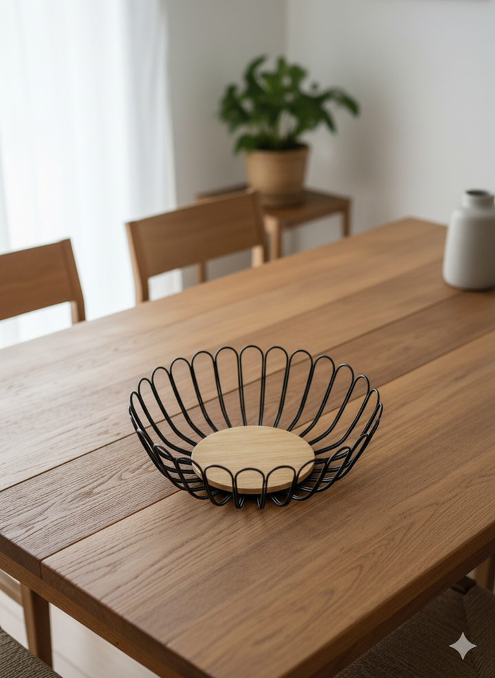 Open wire design allows air to circulate, helping fruits ripen evenly and preventing premature spoilage. The low-profile, wide bowl shape makes contents easily accessible and visible. It also includes a decorative wood accent as the base .Material Primarily metal (likely steel wire) with a black finish (possibly powder-coated for durability and rust resistance) and a central natural wood disc/base