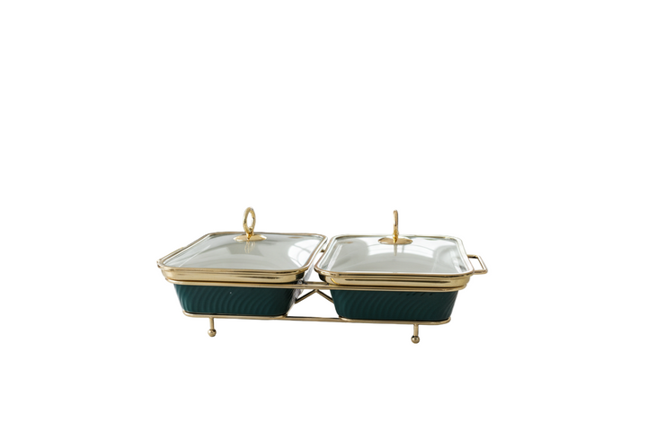 This set consists of two rectangular serving dishes housed within a shared metal stand. The dishes appear to be made of a dark-colored ceramic or similar material, possibly a deep green or blue, with a ridged or fluted exterior design, giving them a textured and sophisticated look. Each dish is fitted with a clear glass lid featuring a decorative, easy-to-grasp gold-tone knob and border. The overall aesthetic is one of luxury, combining practicality with a decorative flair through the use of the contrasting gold-tone metal and dark serving bowls.