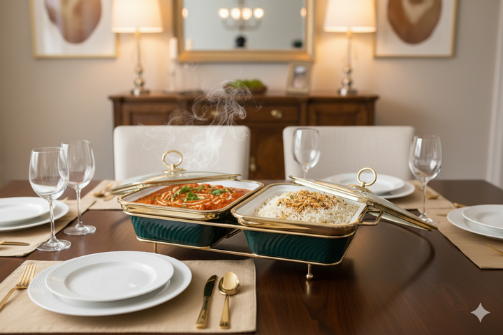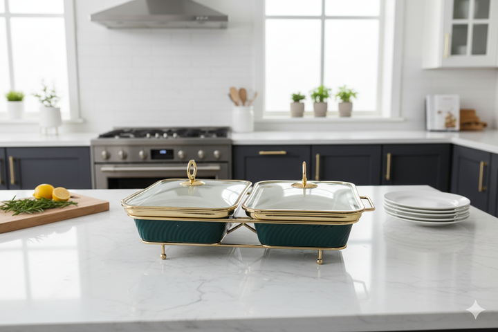 Maintaining Temperature: The glass lids help to retain heat, keeping the food warm for longer periods, which is essential for dinner parties or buffets. The elevated stand also keeps the hot dishes off the table surface.
