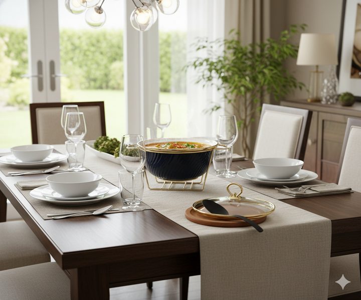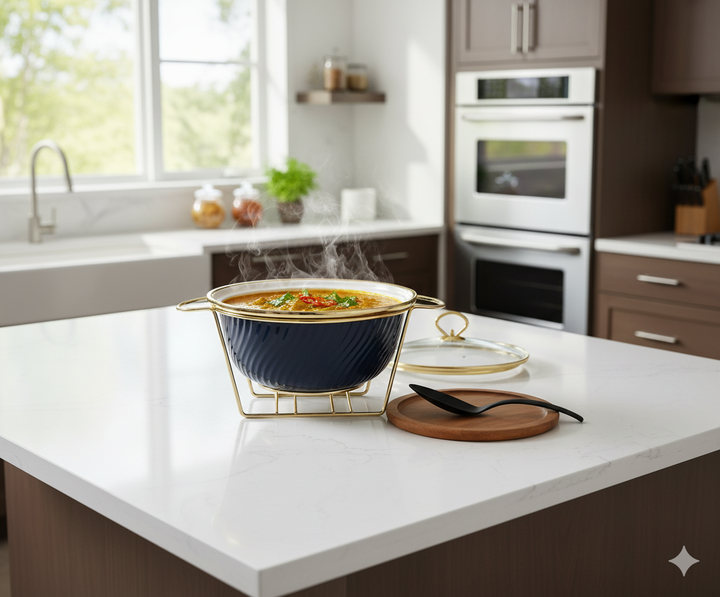 Function: Given the elevated design, it appears to be a mini chafing dish intended to hold a small heat source (like a tealight or sterno) underneath to keep dishes like curries, soups, sides, or dips warm for entertaining.