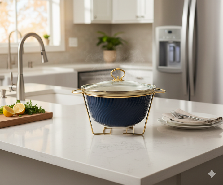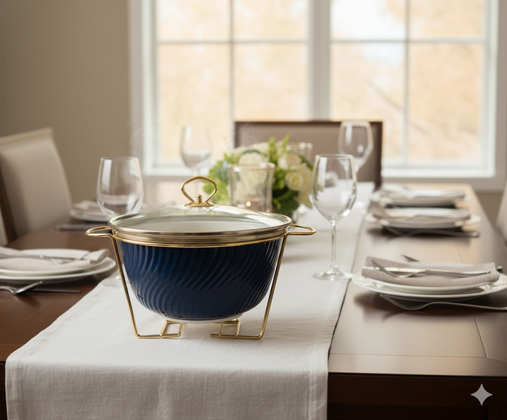 Luxury Ceramic Chafing Bowl with Stand Buffet Server (ROUND BLUE)