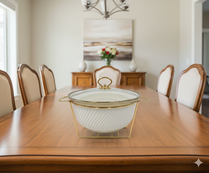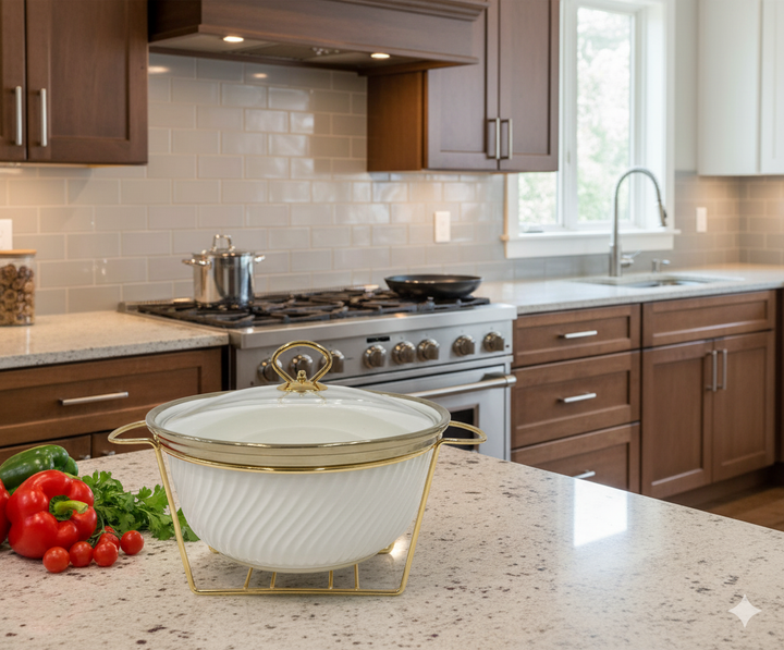 Purpose/UseThe main purpose is keeping food warm for an extended period, which is essential when serving buffets, party appetizers, or main courses at a table. The stand is often designed to hold a small tea light candle or a solid fuel canister (though not visible here, it's a common feature for this style) beneath the bowl, providing gentle, sustained heat. The glass lid traps steam and heat, maintaining the food's temperature and moisture.Material BreakdownBowl: Likely high-quality ceramic, porcelain, or stoneware, chosen for its ability to retain heat and its elegant appearance. Stand and Handles: Metal, probably stainless steel with a gold-colored plating or finish, providing structural support and resistance to corrosion. Lid: Glass, for visibility, with a metal (gold-toned) knob/handle.