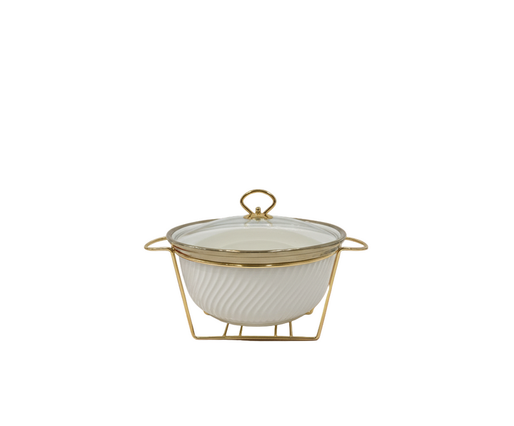 The item is a sophisticated ceramic or porcelain serving bowl with a distinctive white, swirled or fluted texture on its exterior. It is finished with an elegant gold-toned rim around the opening. The bowl rests in a separate, minimalist gold-toned metal stand with two side handles that extend out for easy carrying. The stand elevates the bowl and provides a platform for its warming function. The dish is topped with a clear glass lid, which also features a matching gold-toned handle, allowing the contents to be viewed while keeping the heat in. The overall design suggests a focus on both aesthetics and practicality for formal or celebratory dining occasions.