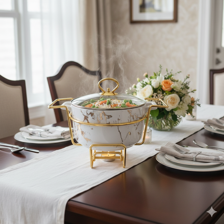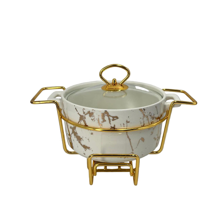 This is an elegant ceramic chafing dish or serving bowl with a distinct gold-veined marble effect pattern on a white base. It features a clear glass lid with a decorative gold-tone handle and is presented in a sophisticated gold-tone metal stand that elevates the dish. The overall design suggests it's intended for formal dining or buffet service, combining practicality with luxurious aesthetics.