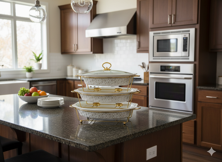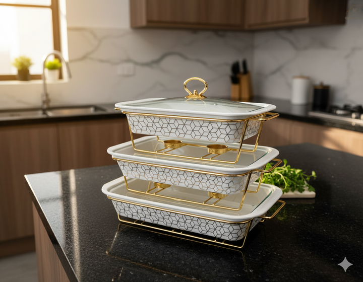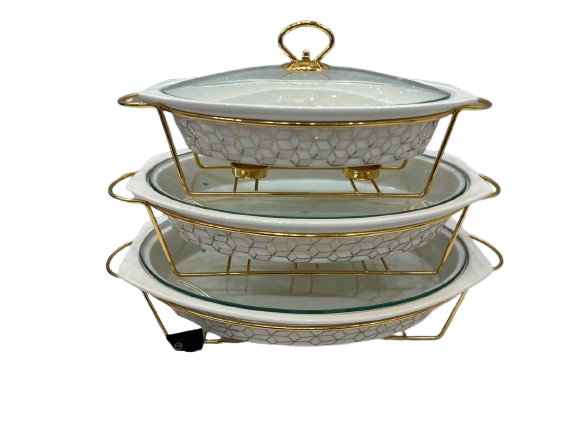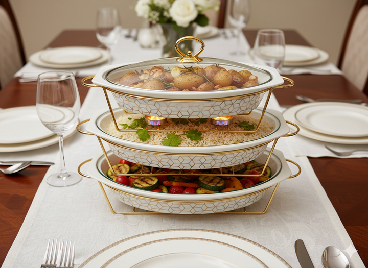3 tier Chafing Ceramic Dish Set Buffet Server (White Gold)