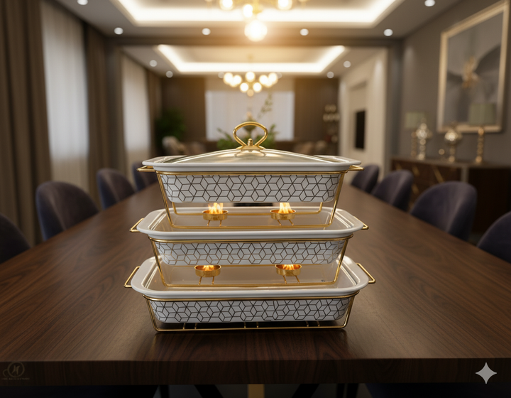 This is an elegant, multi-tiered chafing dish set, perfect for serving and keeping food warm at parties, buffets, or special events. The set features a contemporary and sophisticated design, combining white porcelain with gold-toned metal accents.