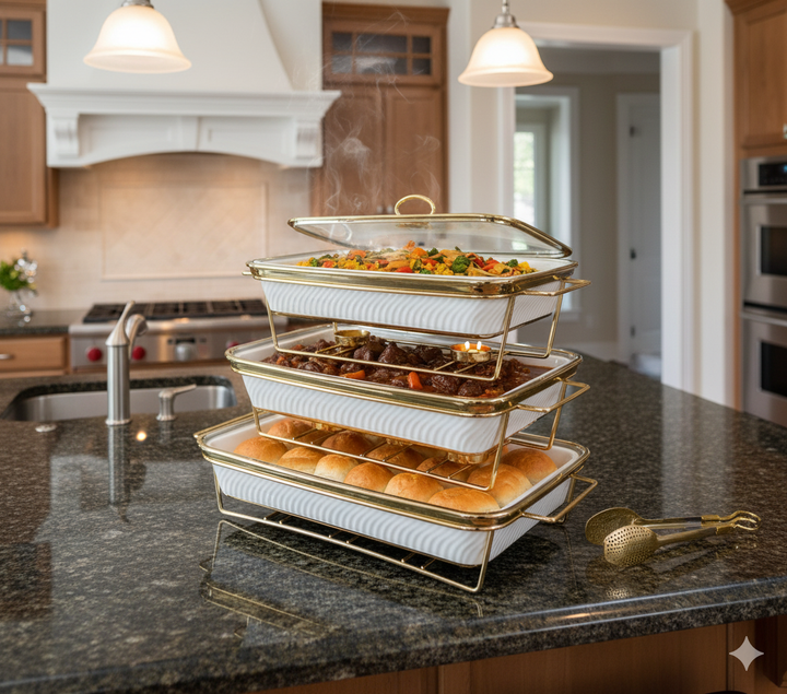 The primary feature and purpose of a chafing dish set is to keep prepared food warm while it is being served at an event, such as a dinner party, catering event, or buffet.